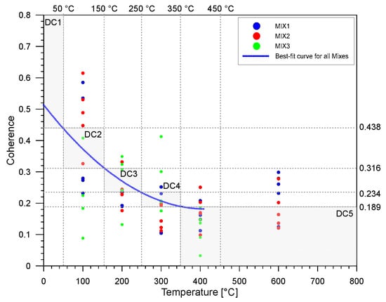 Variation of coherence with increasing temperatures and their corresponding classes. Note that DC means damage class of concrete.