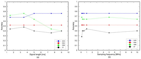 Comparison of accuracies using different variables from preprocessing: (a) signal length (with sampling rate of 10 MHz), (b) sampling rate frequency (with signal length of 5 ms).