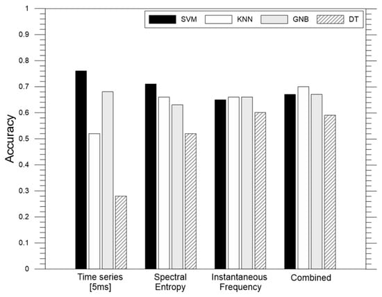Comparison of accuracies using different input data from preprocessing. Note that the sampling rate used is 125 kHz and ‘Combined’ represents the combination of spectral entropy and instantaneous frequency.