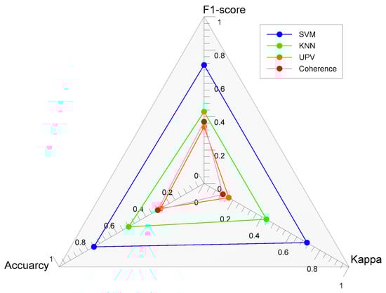 Comparing the three methods, an additional metric, Cohen’s Kappa or Kappa, was added to the overall accuracy and F1-score. Kappa compares the observed accuracy with an expected accuracy (random chance). In addition to evaluating a single classifier, the Kappa statistic is also used to compare classifiers. It also considers agreement with a random classifier, which means that if there is an already established thermal damage classifier or when another random classifier would be used, Kappa calculates the “agreement” between the machine learning classifier and a random classifier. Kappa also considers the imbalance in class distribution. Detailed discussion about Kappa can be read in the study of Cohen [80]. Figure 15 shows the evaluation metrics of using P-wave velocity, coherence, and two machine learning algorithms, SVM and KNN. For the use of machine learning algorithms, the following input data were used—input data of time series with a signal length of 5 ms and sampling rate of 125 kHz. Based on this comparison, it can be seen that using six classes, the best method to be used for classifying thermal damage is by utilizing machine learning with an accuracy of 76.0% and 52.0% from SVM and KNN, respectively. As discussed in Section 3.2 and Section 3.3, conventional methods of analyzing data from ultrasonic wave signals were conducted. Their results were converted to classification analysis for comparison with machine learning thermal damage classification. The use of these conventional methods from P-wave velocity and coherence yielded accuracies of 30.26% and 32.31%, respectively. It is admitted that there is still room for improvement in the performance of machine learning. However, the comparison analysis clearly demonstrates the potential of using machine learning of ultrasonic pulse waves to evaluate the early fire damage of concrete with far improved accuracy compared with conventional ultrasonic wave analysis methods.
