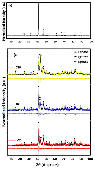 - Huang, J.H.; Kuo, P.C. Effect of quenching temperature on the formation and magnetic properties of the ferromagnetic τ-phase in Mn–Al–C alloys. Mater. Sci. Eng. B 1993, 20, 292–297. [Google Scholar] [CrossRef]