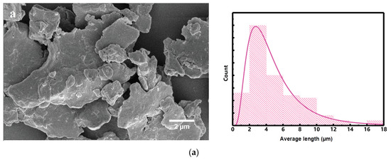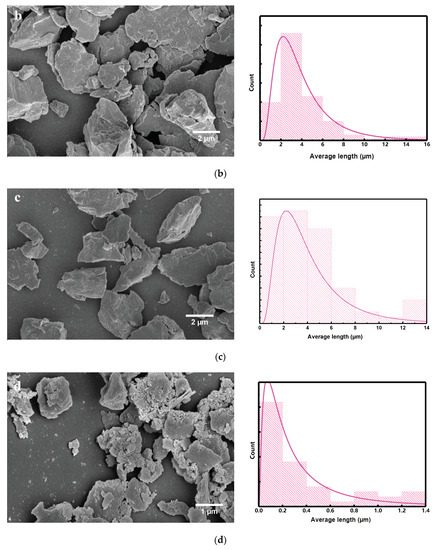 Figure 3a–f displays the FESEM images and particle size distribution histogram of the Mn52Al45.7C2.3 powders milled in the cylindrical and barrel containers. For the cylindrical container, the milled powders are several micron particles in size and the shape of flakes with cracks in some regions, which shows the predominance of impact forces in this process. In the initial steps of the milling, the repeating impact forces transferred to the powders cause compressive strain, resulting in the flake-like shapes of the powders. In longer milling times, the grain size distribution narrows while the powder shape is unchanged (Figure 3c).