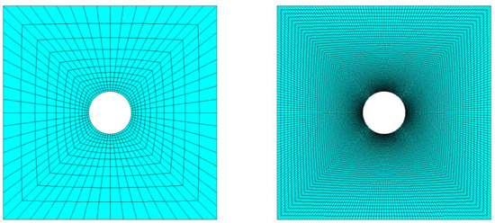 The central square of the plate featuring the coarsest (left) and finest (right) levels of discretization on the unbiased mesh.