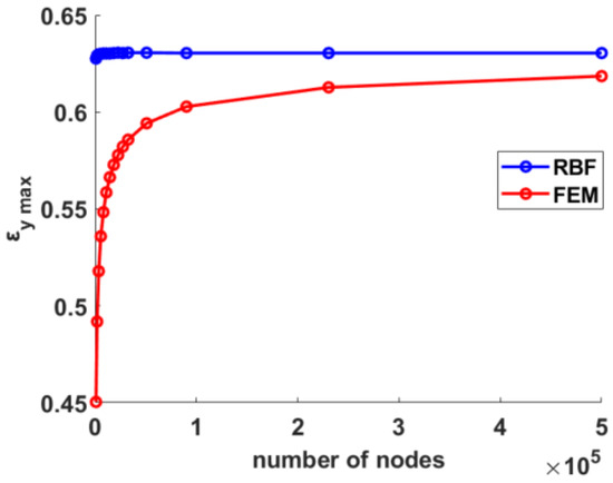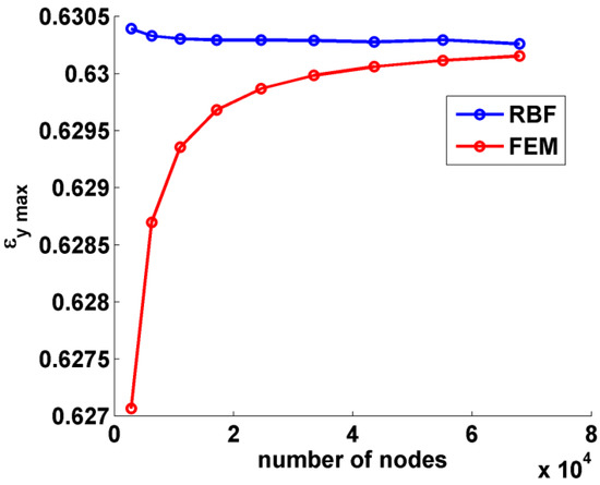 As already pointed out by the authors in [33], the convergence behavior of RBF was much more stable than that exhibited by FEM: the maximum value of εy retrieved with RBF remained practically unchanged over the number of nodes, with FEM results approaching from below. With a relatively small number of nodes, however, in the order of 104, the results obtained with both methods could be considered very good. In must be noted that the value of deformation studied was very high, in the order of 60%.