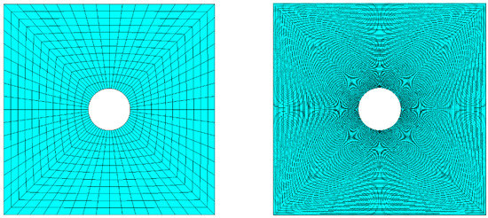 As a first step, convergence obtained with RBF interpolation was compared against FEM. A series of analyses was run having as an object the model of the plate with an increasing level of refinement. Figure 3 compares for the central square of the plate the coarsest and the finest levels of discretization employed for the convergence test, having generated a meshing increasingly refined near the stress concentration with parabolic 8-nodes SHELL281 elements, well-suited for large strain applications.