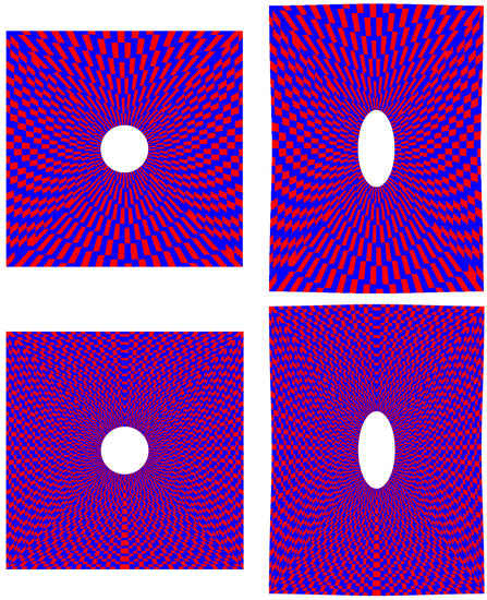 Having demonstrated that, with a proper mesh, refined near the singularity, FEM and RBF methods led to similar results, a second test was carried out on an unbiased mesh, in which nodes were equally spaced radially with respect to the hole.
