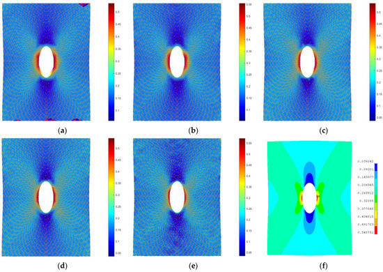 In Figure 8, the strain fields computed by means of the proposed method on the fine grid (using the pictures from the second row of Figure 7) are shown, superimposed on to the image of the deformed specimen, progressively increasing the number of points tracked. Reference FEM contours computed on the full fine grid are shown in Figure 8f. It must be noted that, being a meshless method, the proposed approach supplies everywhere in the space a continuous value of deformation that can be retrieved where desired. To plot results conveniently, contours are applied on a support grid automatically generated by means of a Delaunay triangulation on the tracked points. For this reason, in the first two pictures of Figure 8, in which few points are used, the central hole of the specimen is approximated by a polygonal chain that is only aesthetic and does not affect the solution.