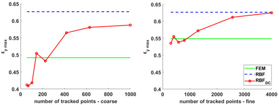 Maximum strain for the coarse (left) and fine (right) meshes computed using the proposed method while increasing the number of tracked points (red) and reference values on the same grid obtained with FEM (green) and RBF (dashed) computation.