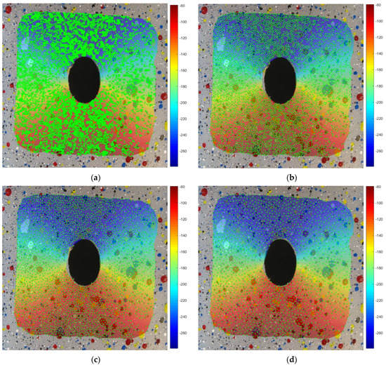 Vertical displacements computed by RBF varying the number of tracked points. (a) 10217 points, (b) 4149 points, (c) 2343 points, (d) 1528 points.