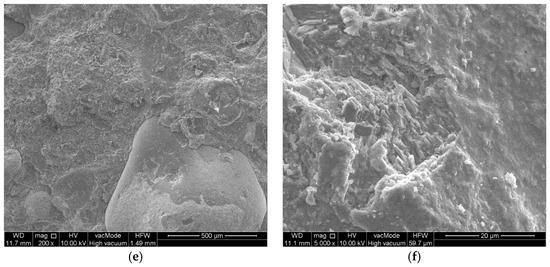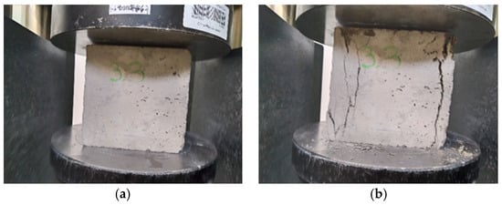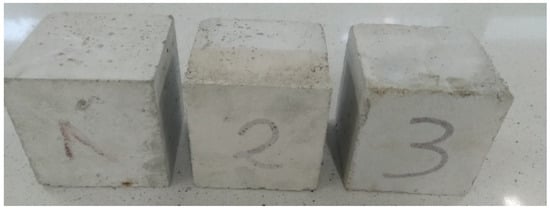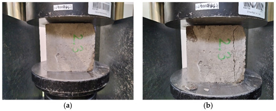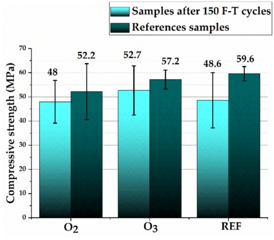 In accordance with the PN-88/B-06250 [51] standard, the ordinary method was used to determine the frost resistance on 12 cubic samples with dimensions of 150 × 150 × 150 mm. Before the test began, 6 samples were saturated with water, weighed and placed in the frost chamber. The samples were frozen by exposure to air at a temperature of (−18 ± 2) °C for a period of 4 h and subsequently thawed by submerging them in water at a temperature of (18 ± 2) °C for a period of 2 h. The 6 reference samples were immersed in water at a temperature of (18 ± 2) °C throughout the freeze–thaw test. After 150 cycles of freezing and thawing (F-T), the samples were removed from the chamber and weighed. Afterwards, a compressive strength test was performed. The result is presented as the average loss in weight of the test specimens in relation to the initial weight and the average decrease in strength of the frozen specimens in relation to the reference specimens expressed as a percentage.