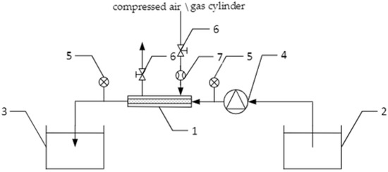 Scheme of the technological installation for the micro-nano bubble water generation: 1—micro-nano bubble generator with a ceramic membrane, 2—primary tank, 3—micro-nano bubble mixing water tank, 4—pump, 5—manometer, 6—valve, 7—rotameter [36].