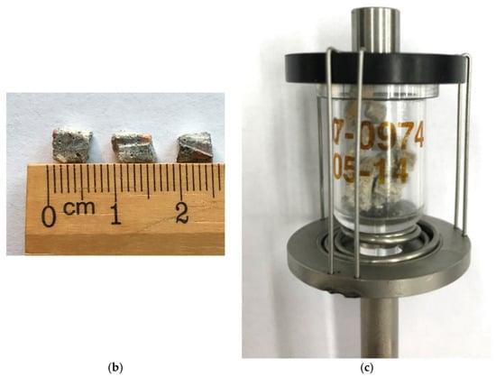 The effect of tap water containing oxygen and ozone micro-nano bubbles on the concrete microstructure was studied using the MIP method. The MIP measurements were carried out on cement paste that was chipped off the original concrete samples. The particle size of chipped pieces of cement paste was around 5 mm (Figure 4a). The specimen of cement paste for the MIP test is shown in Figure 4b. The tests were conducted on two samples of each type of concrete. To remove water from the pores in the material, before the MIP measurement, the samples were dried at a temperature of 50 °C for 14 days. The appearance of the tested sample in the penetrometer before the MIP measurement is shown in Figure 4c. The mass of the tested sample of dried cement paste was around 2–3 g. In the presented research, MIP tests were performed by means of a Micromeritics AutoPore IV9500 device, which can measure pore diameters in the range from about 6 nm to 100 μm. First, the measurement was carried out under low-pressure conditions (with pressure up to 0.54 psia). Subsequently, the sample was placed under high-pressure conditions (with pressure from 0.10 psia up to 60,000 psia). The mercury parameters were as follows: the contact angle was 130 and the surface tension was 458 dyne/cm.
