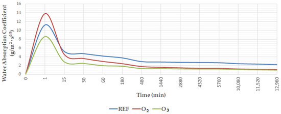 Testing showed a decrease in the capillary absorption coefficient in the concretes containing water with micro-nano oxygen and ozone bubbles. The highest water absorption coefficient of 2.812 (g/m2·s0.5) was observed in the reference concretes, while the concretes containing M-NOzBs and M-NOBs obtained water absorption coefficients 52.3% and 42.7% lower, respectively, than those of the reference concretes.