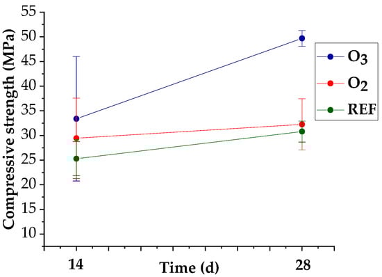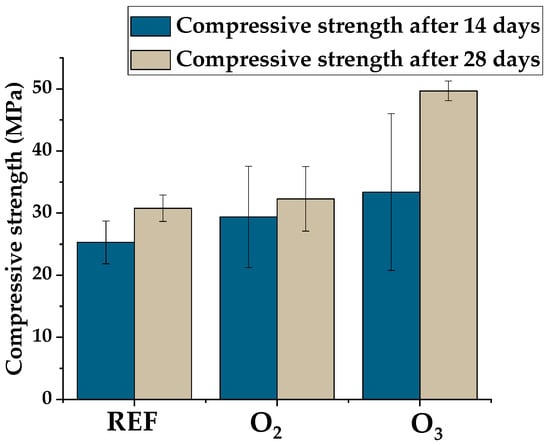 The concrete with water containing M-NOzBs exhibited a high compressive strength increment between 14 and 28 days of testing. Meanwhile, the reference concrete following 28 days of curing and the concrete with micro-nano oxygen bubbles were characterized by 17.8% and 10% increases, respectively, in compressive strength after the 14th day of testing; an increase in strength of almost 33% was found in the concretes with micro-nano ozone bubbles. This means that in the concretes comprising micro-nano ozone bubbles, a significant increase in compressive strength occurred between the 14th and 28th days of maturation. These concretes also achieved the greatest values of compressive strength following 14 and 28 days of maturation. The strength of the O3 concrete increased 1.5 times and that of the O2 concrete 1.1 times.