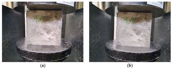 The compressive strength was tested following 14 and 28 days of curing in water on cubic specimens with dimensions of 150 × 150 × 150 mm, in line with EN 12390-3:2019 [53]. In turn, flexural strength was determined on the 100 × 100 × 500 mm specimens using the single-point method, via the procedure described in EN 12390-5 [54].
