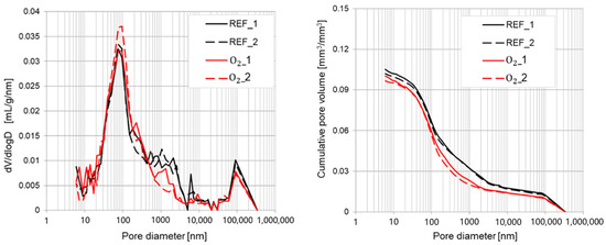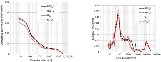 Mercury intrusion porosimetry (MIP) is a widely used and well-known method to investigate the microstructure of the pore system of porous cementitious materials. The MIP method allows for investigating the structure of pores in the range of 3.5 nm to 500 μm [56]. The mercury intrusion porosimetry assumes that all pores in the investigated material have a cylindrical shape and they are completely able to be filled by a non-wetting liquid, i.e., mercury. The MIP technique also relies on the assumption that mercury can be pressed into pores (of a certain diameter) of solid porous material by applying specific external pressure [57,58]. The information about the mercury intrusion volume and applied external pressure supplies the knowledge and data for the analysis of the microstructure of the material. Knowing the external pressure and using Washburn’s equation [57], the diameter of the cylindrical pore can be calculated [59]: