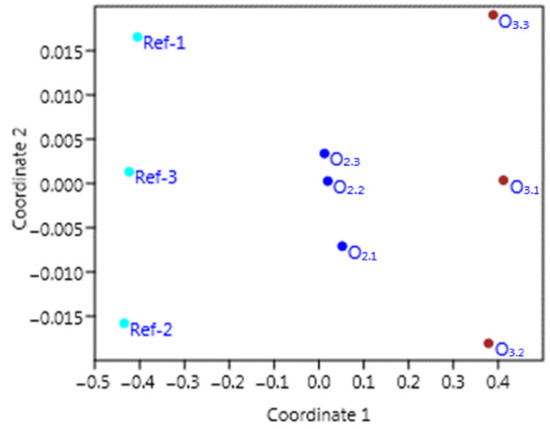 The multidimensional scaling (MDS) method was employed to visualize the degree of similarity for the component of the matrix comprising the data related to the characteristics of the tested concretes as well as the differently applied M-NWs of O2 and O3. The used MDS method [60,61,62] enables the user to obtain a set of points, the distribution of which in a two-dimensional space is in such manner that in the investigated cases (concretes with M-NW O2 and O3 dosage plus reference), the points that exhibited similarity were located near to one other, whereas dissimilar points were far away [63]. Its purpose was to indicate the general similarity of the analyzed set of concrete samples in a single figure, considering all the measured parameters of the concretes subject to change due to the addition of water with micro-nano bubbles. The scaling was carried out at the beginning with an initial configuration. Afterwards, the points were iteratively shifted, resulting in an improved distance fit to the data until further iterations resulted in no further improvement [64]. Generally speaking, the more accurate the data matching the distances in the MDS, the better the proximity structure is represented by the MDS configuration (e.g., sample measurement set with different modifications). A good MDS fit (e.g., as measured by a value close to zero on the STRESS—Standardized Residual Sum of Squares index) can be verified and interpreted visually, which was performed in this paper.