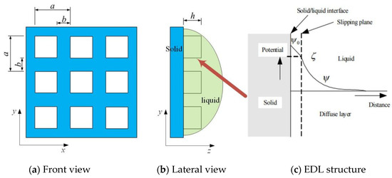 In a textured surface solid-liquid system, as shown in Figure 1, there is one EDL at each interface between the solid and liquid. For the solid-liquid interface at the groove bottom in the depth direction z, the electrical potential distribution ψz can be expressed as follows: