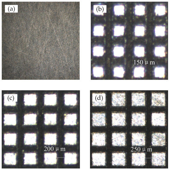 The schematic view of the laser-ablated convex textured surface adopted in this study is shown in Figure 1. Here, a texture consisting of micro-square convexes (blocks) is formed by laser-processed transverse and longitudinal micro-grooves cut into the surface. The clearances between grooves in both transverse and longitudinal directions were the same (a − b). The width of the micro-grooves in both transverse and longitudinal directions was also the same (b), and their depth was set as h. It has been shown that a convex texture can make the surface more hydrophilic [29,30].