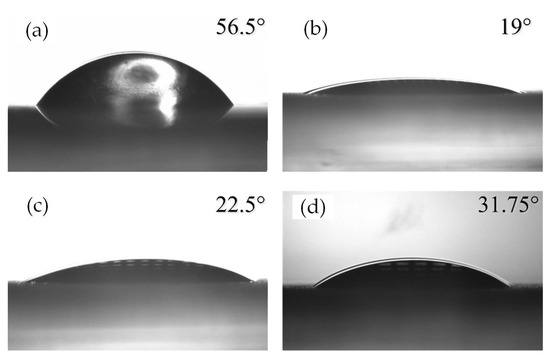 Static contact angle of different surfaces: (a) smooth surface; (b) Textured surface 1; (c) Textured surface 2; and (d) Textured surface 3.