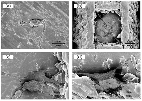 SEM picture of MC3T3-E1 cells morphology grown on the surface of samples (3 h): (a) Smooth; (b) Texture 1; (c) Texture 2; and (d) Texture 3.