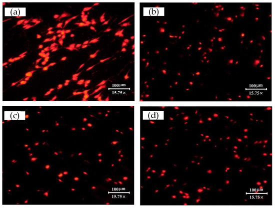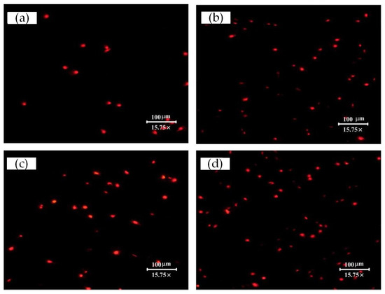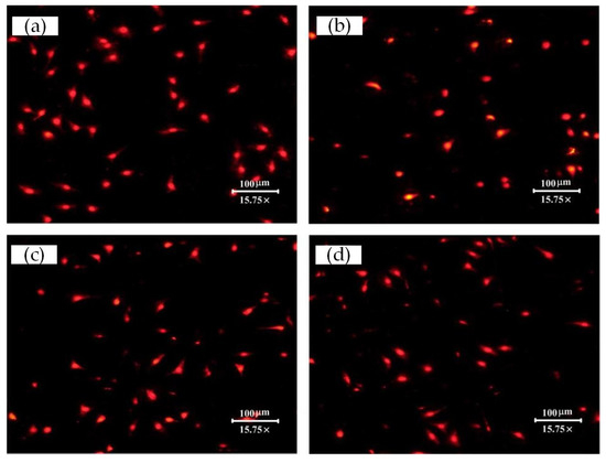 Stereo fluorescence microscope pictures taken for MC3T3-E1 cells adherent on the different surfaces after culturing for 3 h presented the variation in cell density and cell numbers: (a) Smooth; (b) Texture 1; (c) Texture 2; and (d) Texture 3.