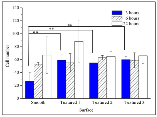 The final results of MC3T3-E1 cell numbers after 3 h, 6 h, and 22 h of growth. Smooth; Texture 1; Texture 2; and Texture 3. ** p < 0.01, versus smooth surface.
