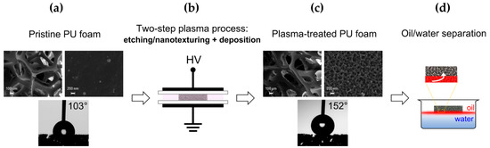 Overview of the present study in which an atmospheric pressure plasma process was optimized to prepare a superhydrophobic/superoleophilic PU foam able to selectively remove oils and nonpolar organic solvents from water: (a) representative SEM images of the pristine open-cell PU foam and photograph of a water droplet placed on it for WCA measurement; (b) surface modification of the foam by a two-step plasma process carried out using a parallel-plate DBD reactor and combining an etching/nanotexturing step and a subsequent deposition step; (c) representative SEM images of the plasma-treated PU foam and photograph of a water droplet placed on it for WCA measurement; (d) oil/water separation test carried out with the plasma-treated PU foam.