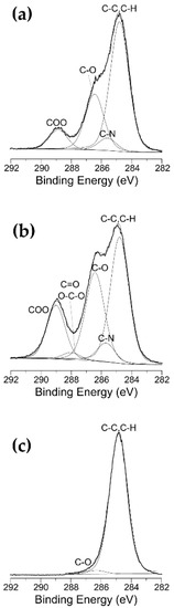 XPS C 1s spectra of (a) the pristine PU foam (reproduced with permission from 25), (b) the PU foam after step 1 (te/n = 10 min), and (c) the PU foam after the two-step plasma process (te/n = 10 min, td = 10 min).