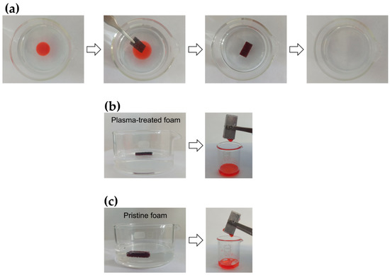 Oil–water separation experiments were carried out with the pristine and plasma-treated foams to evaluate their ability to remove low-density oils floating on the water’s surface (Figure 7a). Figure 7b shows that when the superhydrophobic plasma-treated sponge was placed in a beaker containing a mixture of bidistilled water (i.e., the transparent higher-density liquid) and light mineral oil (i.e., the red-dyed lower-density liquid), it was able to float on the mixture’s surface and selectively absorb only the oil. This can be appreciated from the photograph taken during mechanical squeezing, which shows that only the mineral oil (i.e., the red-dyed liquid) was collected in the small beaker when the plasma-treated sample was squeezed. The plasma-treated foam exhibited a high separation efficiency (>99%), which remained unaltered after 20 separation cycles. Interestingly, Figure S8 shows that the S value of the plasma-treated foam was also greater than 99% when the separation tests were carried out using mixtures of mineral oil with acidic (pH = 2), basic (pH = 12) or saturated NaCl aqueous solutions as well as when heating the mineral oil/water mixture at 50 °C and 80 °C. In contrast, Figure 7c clearly shows that the pristine foam sinks below the surface of the mineral oil/water mixture during the separation experiment. This happens because the foam absorbs not only the oil floating on the water’s surface, but also a certain amount of water (i.e., the denser liquid), as confirmed by the photograph showing that both water and mineral oil were recovered by sample squeezing (Figure 7c). In agreement with these observations, weight measurements confirmed that the untreated sponge absorbs a liquid amount that is 25% greater than the amount of oil present in the original mixture (i.e., the S value of the pristine foam is 125%, Equation (2)).