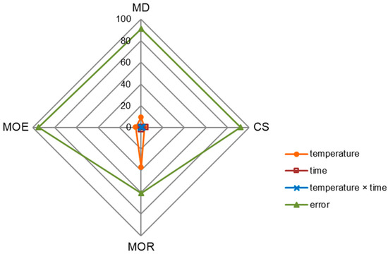Figure 1). The modification temperature showed a significant effect on all of the analyzed properties, with the greatest impact on the MOR of black poplar wood (factor influence at the level of 37%). In the case of the other properties, i.e., MD, CS and MOE, the impact was below 10%. On the other hand, the modification time was responsible for a small extent for the variability of the CS and the MOR of black poplar wood (factor influence at the level of 4%). The interaction between temperature and modification time did not significantly affect the analyzed properties of wood. The indicated relationships confirm those presented in