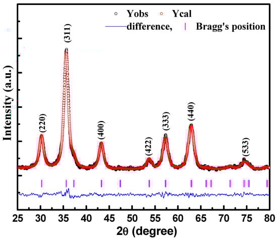 The crystalline structure and phase of the CoFe2O4 nanostructures were characterized using room temperature XRD measurements, as shown in Figure 1. The Fullproof program unitized for the Rietveld refinement process clearly inferred that the CoFe2O4 nanostructures had a single-phase nature with phase face-centered cubic (FCC) geometry and excluded the existence of any secondary phase. The theoretical and experimental data points are symbolized by red-colored and black-colored circles, respectively. Bragg’s positions corresponding to the FCC structure are highlighted using vertical lines of link color. The difference between experimental and theoretical data is represented by the blue lines. The value of χ2, which describes the quality and reliability of refinement, was 1.2. It is worth mentioning here that all the XRD peaks showed broadening, which was attributed to the nanocrystalline nature of the CoFe2O4 nanostructures. The diffraction peaks observed at 2θ = 29.92°, 35.34°, 42.9°, 57.43°, and 62.44°, and corresponding to (220), (311), (400), (333), and (440) planes were assigned to the spinel structure of CoFe2O4 nanostructures with the space group Fd3m. All the diffraction peaks indexed in the XRD pattern were analogous to the JCPDS card number 22–1086 []. The average particle size, D, of CeF2O4 nanostructures was determined using the highest intense peak (311), using Scherrer’s equation,  [], where β is the broadening of the diffraction peak at angle θ. The β was measured using the equation , where  highlights the full width at half maximum (FWHM) of the diffraction peaks and B refers to the instrumental broadening. The λ is the wavelength (1.5406 Å) of the X-ray used to record the pattern. The diffraction peaks were fit by the mean of the Voigt function. The particle size evaluated using the high-intensity low angle (311) and high angle (440) peaks were found to be ~7.0 nm. The lattice parameter (a) was also calculated using the formula , here (h, k, l), represents the miller indices whereas dhkl denotes the interplaner spacing determined using the XRD pattern. The lattice parameter estimated using the (311) peak was found to be 8.3581 Å. Furthermore, the X-ray density (theoretical) was also calculated using the formula in [], dhkl = 8M/Na3, where M stands for the molecular weight of CoFe2O4 and N denotes the Avogadro number, whereas a highlights the lattice constant and where 8 represents the number of atoms per unit cell. The X-ray density was found to be ~5.649 g/cm3.