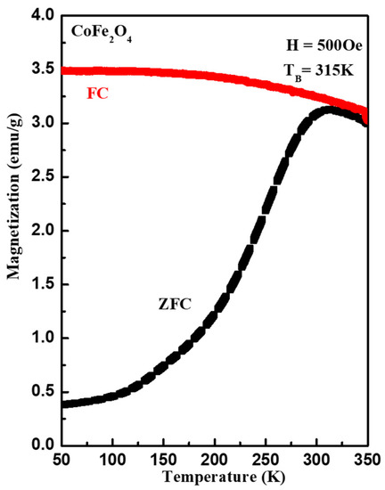 Figure 3 demonstrates the magnetization versus temperature (M-T) measurement of the CoFe2O4 nanostructures. The M-T measurements, performed in zero-field-cooled (ZFC) and field-cooled (FC) measurements mode, followed a procedure in which the sample was cooled from 300 K to 50 K in the absence of (ZFC); thereafter, a static magnetic field of 500 Oe was applied and the magnetization was recorded during the warming-up cycle. Then, the sample was cooled from 300 K to 50 K in the presence of the magnetic field of 500 Oe (FC) and the magnetization was measured in the warming-up cycle. The ZFC–FC measurements indicated that the CoFe2O4 nanostructures showed ferromagnetic ordering at room temperature, with a blocking temperature (TB) of 315 K, which is a transition from a superparamagnetic state to a blocked state. Here, it is worth mentioning that a change in FC and ZFC magnetization below 315 K resulted from the energy barriers of the magnetic anisotropy []. The TB of magnetic materials depends on the interparticle magnetic interactions, as well as particle size. With the help of TB and the volume of the single particle, the magnetic anisotropy constant K was calculated using the formula () and observed to be 3.2 × 105 J/m3, where  is Boltzmann’s constant.