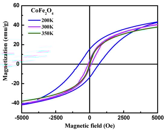 Figure 4 represents the magnetic hysteresis (M-H) loop of CoFe2O4 nanostructures measured at different temperatures. It can be observed that the CoFe2O4 nanostructures demonstrated ferromagnetic behavior at temperatures 200 K and 300 K, whereas the reversible M-H curve at 350 K reflects a superparamagnetic behavior. From Figure 4, it is evident that the area under the hysteresis loop increased with a decrease in the temperature. The values coercive field (HC) and remanence magnetization (MR) calculated from the hysteresis loop were 755 Oe and 16 emu/g at 200 K, and 91.0 Oe and 3.7 emu/g at 300 K, respectively. It can be observed from Figure 4 that the magnetization was unsaturated until applying 5 T. Therefore, the MS was calculated by extrapolating the M versus H/T curves. The saturation magnetizations (MS) calculated using M-H loops were 50.0 emu/g, 48.0 emu/g, and 46.0 emu/g at 200 K, 300 K, and 350 K, respectively. The values of the various magnetic parameters (see Table 1) were found to decrease with an increase in temperature. This can be attributed to the decrease in the exchange interactions between the spin moments, because of the thermal activation energy.
