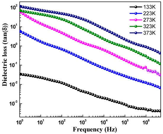Figure 5 depicts the dielectric constant (ε′) versus the frequency curve, showing the real part of the dielectric constant of CoFe2O4 nanostructures measured at different temperatures in the frequency range of 1.0 Hz to 10 MHz. The value of the dielectric constant was determined using the formula , where d is the thickness of the pellet,  is the capacitance of the parallel pellet, A is the cross-sectional area of the painted surface, and  is the space permittivity of free space. The value of ε′, as shown in Table 2, was found to increase with the increase in the temperature. Additionally, the dielectric constant was found to decrease, as observed in Figure 5, with an increase in frequency, which is the usual behavior reported for most polar dielectric materials []. However, it was noticed that the decreasing behavior became slower at the higher frequencies and showed an almost frequency-independent behavior. This type of frequency-dependent nature of ε′ can be interpreted using the Maxwell–Wagner two-layer model, which is consistent with Koop’s theory of dielectrics []. Koop’s model explains that dielectric materials are made-up of conducting grains, as well as insulating grain boundaries. It is reported that grain boundaries result in ferrites because of the oxidation of superficial reduction of crystallites as a result of the sintering process [,,,]. When dielectric measurements are performed in the alternating field, the grain boundaries dominate at lower frequencies, whereas high conductive grains are effective at high frequencies. Therefore, the voltage applied to the specimen drops predominantly on both sides of the grain boundaries and causes space charge polarization, since the hopping of electrons inside the material accumulates at the grain boundaries because of high grain boundary resistance. The large value of the ε′ in CoFe2O4 nanostructures is ascribed to the greater effect grain boundaries have over grains than at lower frequencies, which indicates the major role of space charge polarization. However, the ε′ starts to decrease as the frequency increases further, because of the weak space charge polarization. At high frequencies, electrons lag behind, while following the changes of the applied field exchange, and thus ε′ decreases and become steady beyond a certain frequency limit. Figure 6 highlights dielectric loss (tanδ) versus frequency of CoFe2O4 nanostructures. The dielectric loss was measured in the frequency range of 1.0 Hz to 10 MHz at different temperatures. The dielectric loss tangent ((tanδ) can be determined using the formula , where  is the complex dielectric constant. The dielectric loss tangent (tanδ) signifies the loss of energy from the applied field into the material and that is dissipated in the form of heat energy. It was found that the dielectric loss decreased with an increase in frequency of the applied field, indicating a normal dispersion behavior. It can be seen from Figure 6 that tanδ has a low loss value at higher frequencies, which shows its suitability for applications in high frequency devices. The high value of tanδ at low frequency may be because of its high resistivity (owing to grain boundary). Since the electrons’ hopping among Fe2+ ⇔ Fe3+, as well as hole transfer involving Co2+ ⇔ Co3+, require more energy, this causes the high value of tanδ. Moreover, in the high frequency region, the hopping of electrons requires little energy, due to the low resistivity (because of grains), and as a result, the loss is small. Furthermore, the value of tanδ is also dependent on other factors, such as the sintering temperature of the material, composition, structural homogeneity, and the Fe2+ and Fe3+ content in samples. Additionally, it can be noticed that the values ε′ and tanδ increase with temperature and display a semiconducting behavior (See Table 2). This may be due to the fact that, at low temperatures, the charge carriers do not have sufficient energy and because of that cannot orient themselves along the course of the applied field variation and, hence, contribute weakly to the polarization. An increase in temperature causes the charge carries to obtain sufficient thermal energy and they start to follow the change in the externally applied field, and as a result of this, the dielectric constant increases.