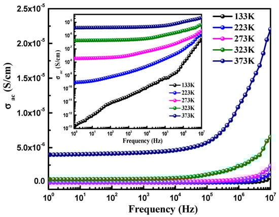 σac versus frequency curve of CeFe2O4 nanostructures at different temperatures. Inset shows log (σac) versus log (frequency) curve of CeFe2O4 nanostructures at different temperatures.