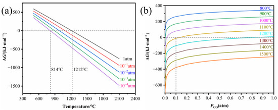 Gibbs’ free energy change of reaction (1). (a) Variation in temperature at different PCO; (b) variation with PCO at different temperatures.
