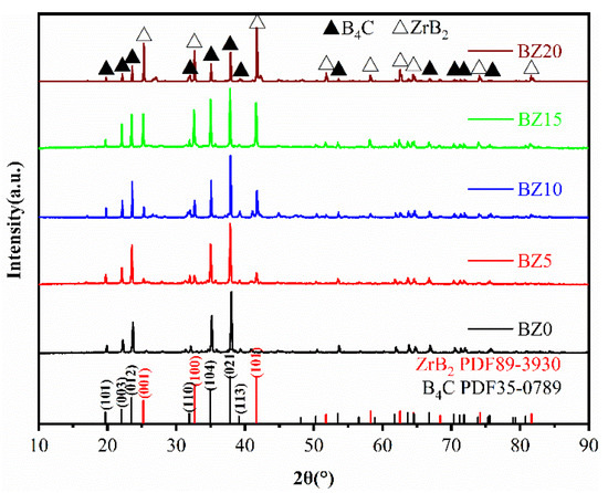 The XRD patterns of B4C ceramics prepared by SPS with different ZrB2 contents are shown in Figure 2. The ceramics are composed of B4C and ZrB2, and no residual nano-ZrO2 phase can be detected, indicating that nano-ZrO2 and B4C completely reacted to form the ZrB2 phase. The B4C in the samples all had the rhombohedral crystal structure (PDF #35-0798). The diffraction peaks of samples at 2θ of 21.21°, 32.64°, and 41.69° were all taken from the ZrB2 crystal (PDF #89-3930), and correspond to the (110), (200) and (211) crystal planes of its hexagonal crystal structure, respectively. The intensity of the ZrB2 diffraction peak increases with the addition of nano-ZrO2, while the intensity of the B4C diffraction peak is the opposite, which is consistent with the expected results. The XRD results indicate that nano-ZrO2 can react with B4C in situ to form ZrB2, which can promote the diffusion effect between B4C particles during sintering and achieve the densification of B4C ceramics.