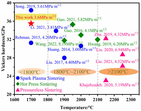 The Vickers hardness and fracture toughness of B4C ceramics prepared under different sintering methods in recent years are shown in Figure 10 [20,21,23,24,25,26,27,28,29,30,31,32,33]. The different sintering methods described are pressureless sintering, hot-pressure sintering and spark plasma sintering. Although the Vickers hardness and fracture toughness of B4C ceramics are high, the sintering temperature of dense B4C ceramics is almost above 1800 °C. In this study, B4C ceramics are successfully prepared at 1700 °C by in situ reaction using nano-ZrO2 as a sintering aid. The maximum values of Vickers hardness and fracture toughness are 35.5 GPa and 3.6 MPa·m1/2, respectively. The in situ-generated ZrB2 inhibits the growth of B4C grains, deflecting and bifurcating the cracks, thus enhancing the mechanical properties of B4C ceramics.