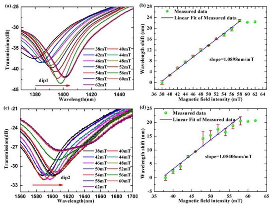 - Zhou, X.; Li, X.; Li, S.; An, G.; Cheng, T. Magnetic Field Sensing Based on SPR Optical Fiber Sensor Interacting with Magnetic Fluid. IEEE Trans. Instrum. Meas. 2019, 68, 234–239. [Google Scholar] [CrossRef]