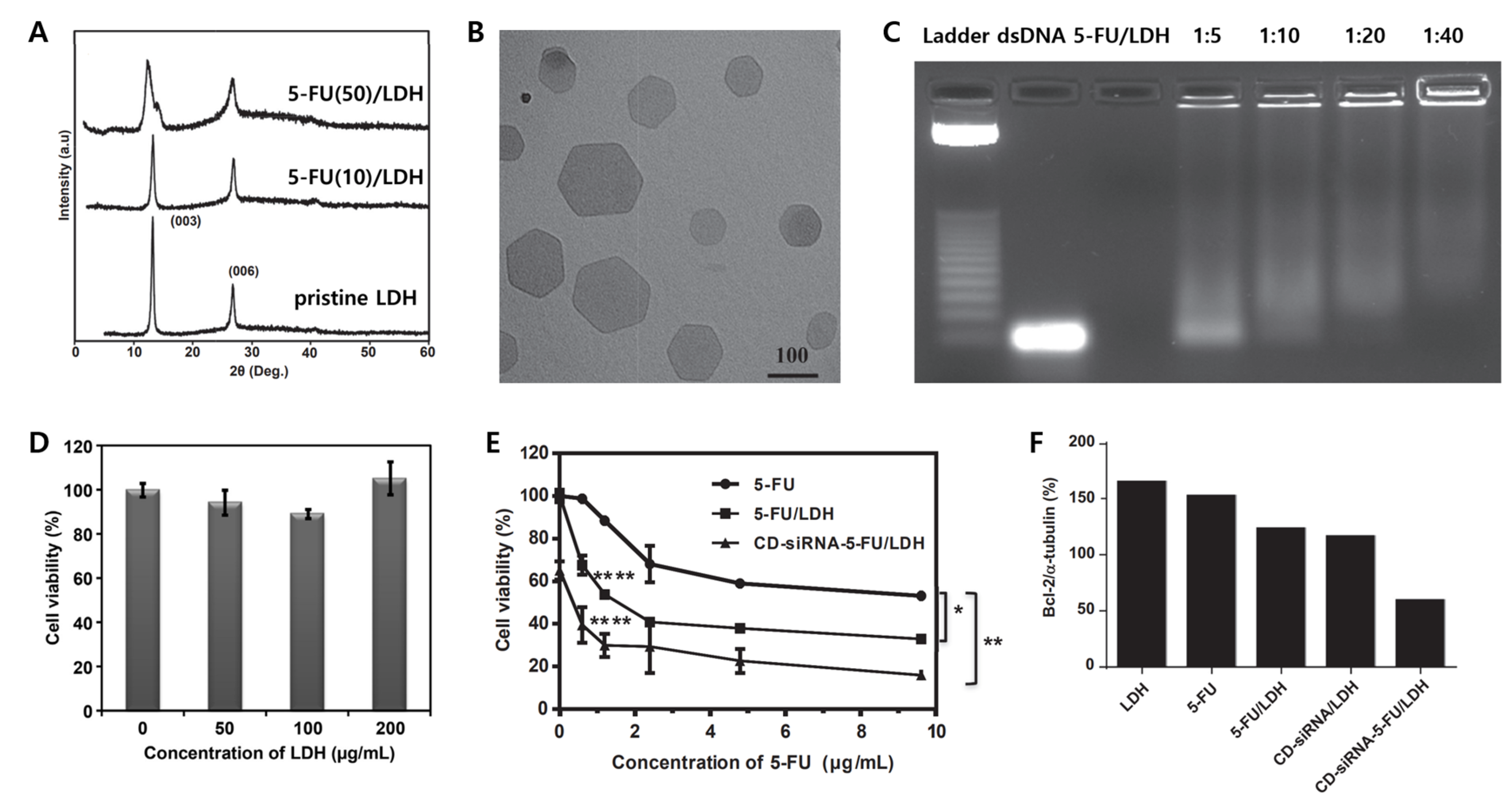 | MgAl | Co-precipitation, ion-exchange | 5-FU, CD-siRNA | MCF-7 cells, U2OS cells, HCT-116 cells | Combination therapy (Gene, Chemo) | Combined two therapeutic applications. | [34] |