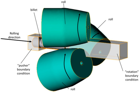 Radial shear rolling (RSR) is a screw (or rotary or helical) rolling process when the feed angle of the rolls is 18–20 degrees or more [1,2]. The trajectory-controlled variant is the most widespread variant of RSR [2,3].