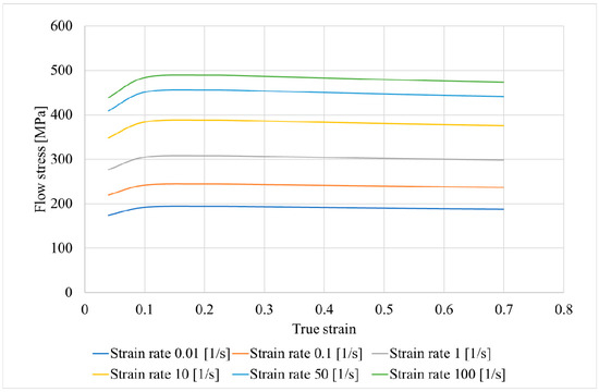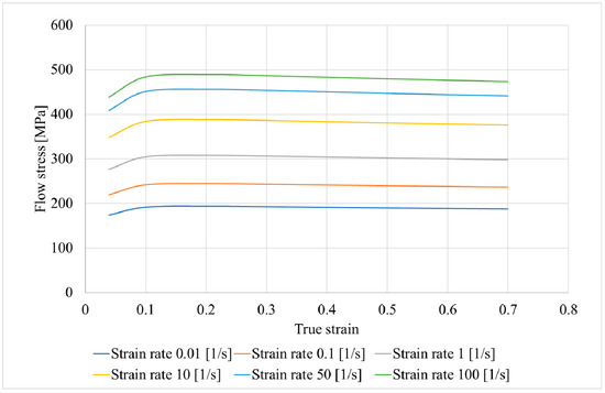 For the computer simulation, models of rolls and billet were made using SolidWorks; then, the assembly was conducted from the models, saved in “.step” format, and uploaded to the QShape geometry editor. The diameter of the rolls in the gap (or draft) was 300 mm, the cupped scheme of roll positioning was used, and the rolls’ exit taper was 11 degrees. The finite element mesh was generated for each object of the assembly, and the roll rotation axes were set using the QShape menu tools. After that, the assembly was uploaded in QForm, the initial and boundary conditions were set. The “pusher” and “rotation” boundary conditions were set for the billet (Figure 1). The friction factor was set at 5 in the Siebel friction law for “roll–billet” interaction. The rolls’ rotational velocity was set 9.42 rad/s. The feed angle of the rolls was set at 20 degrees, and the inclination angle of rolls was set at 10 degrees. The simulation was conducted in accordance with the condition that a maximum tetrahedral finite element size was not more than 2 mm. The billet’s material was set as Ti-6Al-4V, and the flow stress of this material at different strain rates and temperatures was given in table form. The heat exchange between the rolls and billet was set as “Simple” [46]. After that, the QForm preprocessor, using the table data, obtained the flow stress curves using interpolation. The flow stress depended on the strain (Figure 2) at different temperatures (750, 800, 900, 1000, and 1100 °C) and strain rates (0.01, 0.1, 1, 10, 50, and 100 s−1). The RSR was simulated according to the route: Ø76→Ø65→Ø55→Ø48 mm.