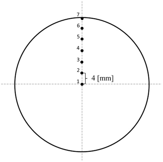 When the computer simulation was complete, 7 points with 4 mm equal distance between them were chosen in the cross section of the 48 mm diameter billet at the stationary stage. One of the points was in the center of the billet, and one was on the surface (Figure 3). The accumulated strain and the total velocity values were calculated for these points.