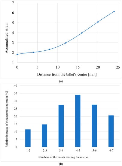 The results of computer simulation made it possible to evaluate and illustrate, by means of a point diagram, how the accumulated strain value changed in the tracked points. Then, the trend line, which illustrated the accumulated strain variation along the billet’s radius, was calculated (Figure 6a). The relative increase (in percent) in the accumulated strain between the neighboring tracked points was also estimated (Figure 6b).
