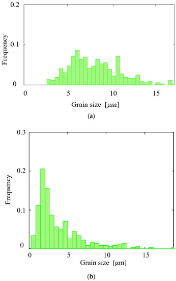 The histograms of the α-phase and β-phase grain size distribution in the cross section of the rolled billet (after all three passes) as a result of the microstructure research were plotted (Figure 8).