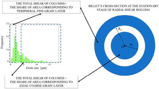 A technique to determine the limits of the neutral cylindrical surface, whose radius range of variation was estimated using the computer simulation according to Figure 5 and Figure 6b, was designed. The technique was as follows. The left of the two highest columns (maximums) and the columns to left of it were identified (there were three columns in total). Their shares of all the grain sizes sampled were: 0.025, 0.110, and 0.205. The sum of the frequencies of all the specified columns was 0.340. This share (0.340) was set equal to the peripheral fine-grain layer share from the whole cross section area of the billet at the stationary stage of RSR (outer blue ring are on Figure 9). In an analogous way, the right of the two columns (maximums) was identified in the histogram along with the columns to the right of it. The shares of this right column (maximum) and the columns to the right of it in the sampling were calculated (there were 18 columns in total): 0.065, 0.020, 0.041, 0.031, 0.017, 0.005, 0.010, 0.009, 0.005, 0.004, 0.003, 0.005, 0.007, 0.008, 0.001, 0.002, 0.001, and 0.001. The total sum of these fractions was 0.235. This share (0.235) was set equal to the coarse-grain axial layer share from the whole cross section of the billet at the stationary stage (blue circle in Figure 9). With these shares’ values, using the circle formula, the values of the radii R1 and R2 were found; these radii corresponded to the border between the coarse-grain and fine-grain structures (Figure 9). The R1 was equal to 11.5 mm, and the R2 was equal to 19.5 mm. These radii constrained the neutral cylindrical layer, separating the peripheral coarse-grain and axial fine-grain layers. In other words, the radius of the neutral cylindrical surface, estimated by the β-phase grain size distribution histogram (Figure 8b) analysis, was within the 11.5–19.5 mm limits.