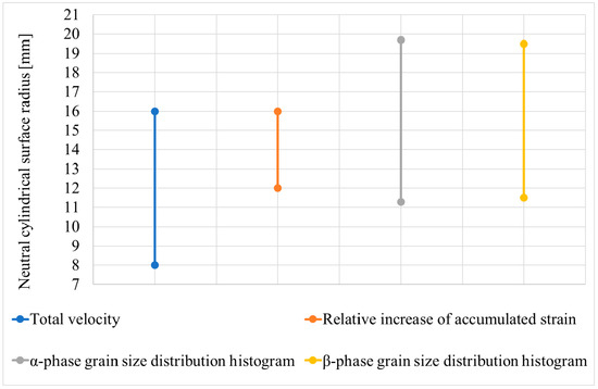 According to the technique illustrated in Figure 9, the limits containing the neutral cylindrical surface radius were calculated using the α-phase grain size distribution histogram data (Figure 8a). The interval was 11.3–19.7 mm. The intervals limiting the neutral cylindrical surface radius were compared (Figure 10). Comparison was made for the limits calculated using the computer simulation results, namely the variation in the total velocity of the tracked points (Figure 5) and the relative increase in the accumulated strain (Figure 6b), and the limits calculated using the microstructure analysis, including the α-phase grain size distribution histogram (Figure 8a) and the β-phase grain size distribution histogram (Figure 8b) data.