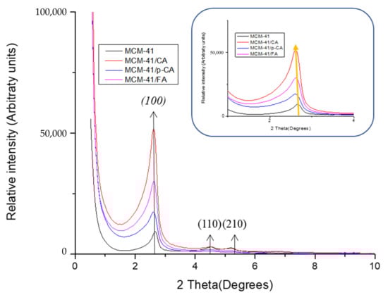 All diffractograms recorded on MCM-41 mesoporous materials (Figure 2) show a strong diffraction peak corresponding to the (100) crystallization plane and three other peaks of low intensity attributed to the (110), (200) and (210) crystallization planes feature the ordered hexagonal structure [44]. The ordered mesoporous structure was present in both MCM-41 and polyphenol-loaded mesoporous materials. These peaks are consistent with literature data [46]. In the case of MCM-41 materials loaded with the three polyphenols, a slight shift of the peaks can be observed in the diffractograms of the mesoporous MCM-41/polyphenol materials compared to the characteristic peaks of the MCM-41 material (Figure 2) [47,48]. This behavior can be correlated with the decrease in the pore volume (correlation with BET analysis) as a result of loading the mesoporous material with polyphenols. In conclusion, we can support the fact that a large part of the quantity of polyphenols was loaded into the particles and only a small part remained on the surface of the material.