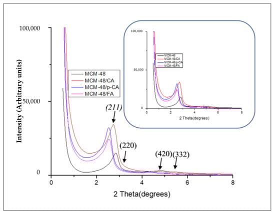The diffractograms recorded on MCM-48 mesoporous materials (Figure 3) show two major peaks corresponding to the crystallization planes (211), (220), (420) and (332). These peaks are consistent with literature data [44]. From the diffractograms recorded on the MCM-48 materials loaded with the three polyphenols, it can be observed that there was a slight shift of the (211) peaks [47,48] due to the loading process. In addition, the characteristic peaks of the (420) and (332) crystallization planes decreased in intensity as a result of the polyphenol adsorption. The decrease in intensity and the displacement of the peaks characteristic of the (211) and (220) crystallization planes, from the diffractograms of the mesoporous MCM-48-type materials loaded with polyphenols, may indicate the loading of the polyphenols into the MCM-48 pores and thus a strong interaction between the two components (Figure 3).